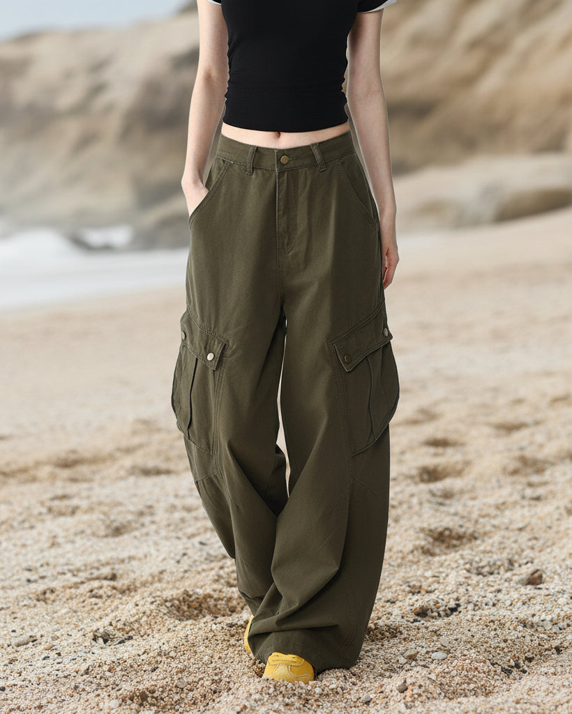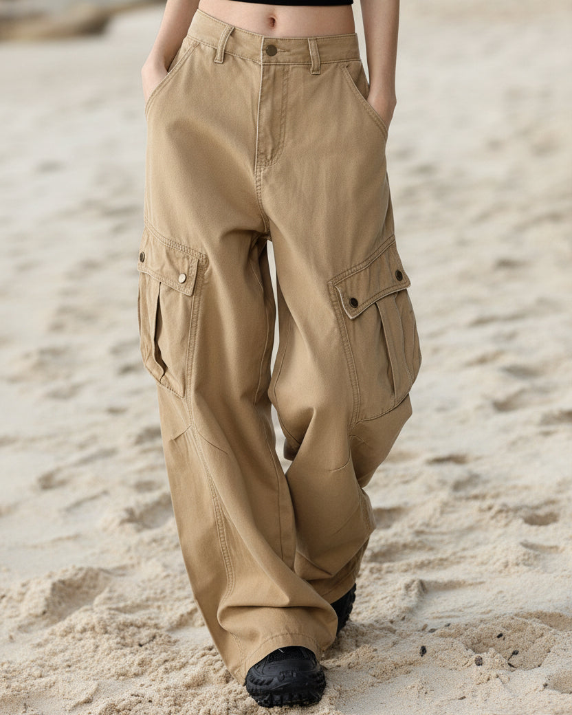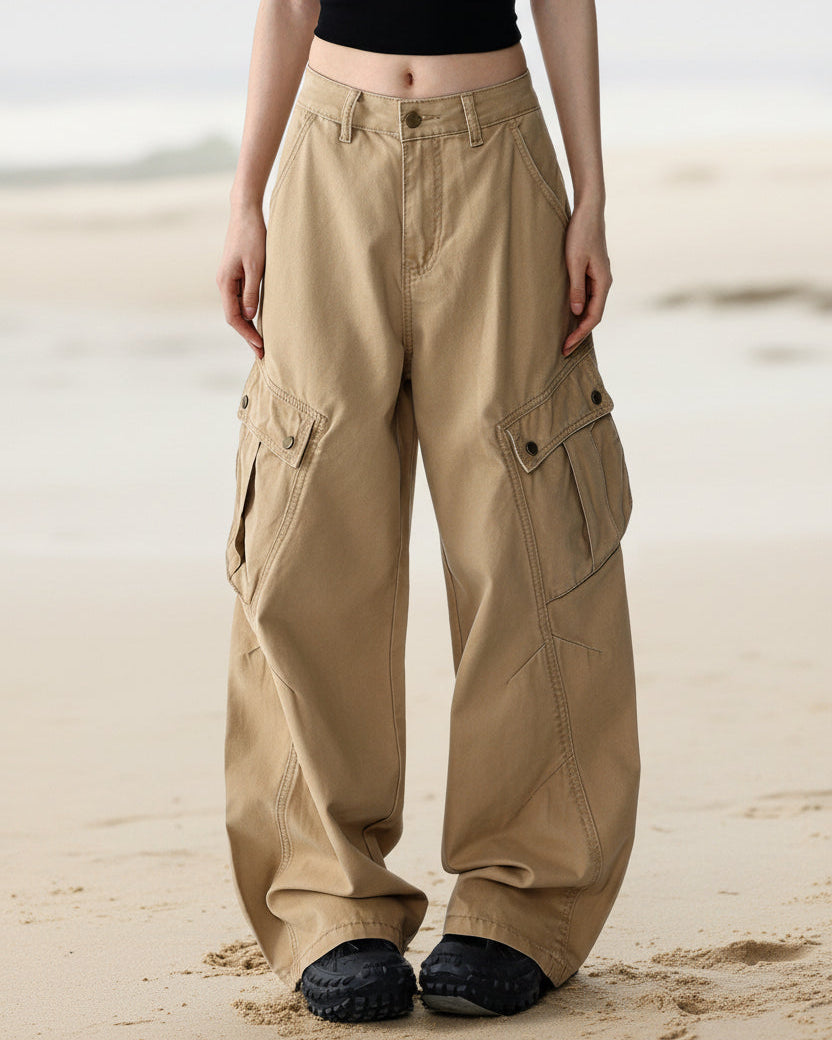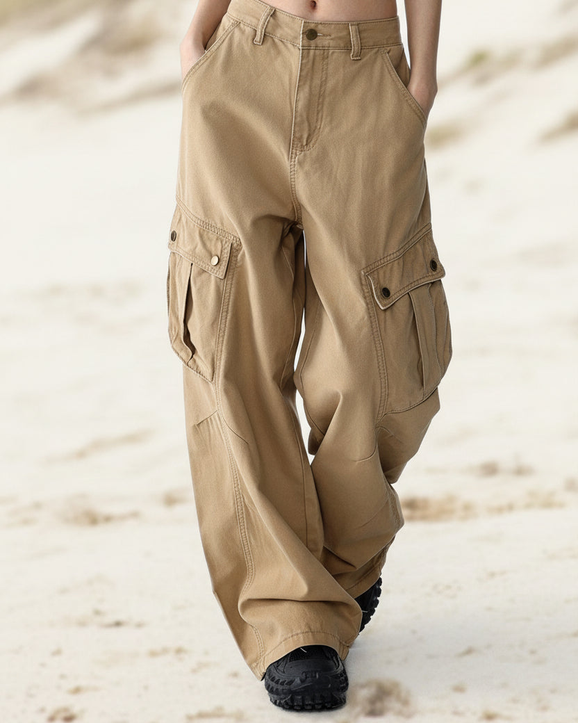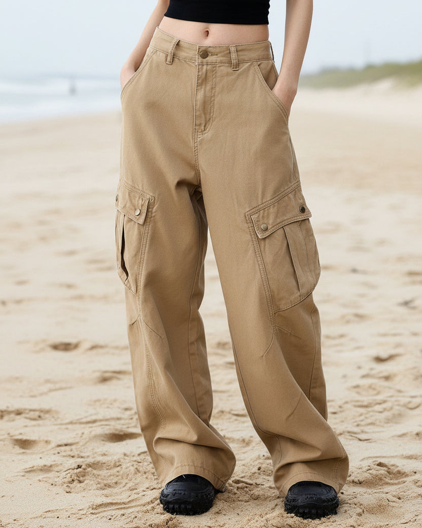ASHORE Shop khaki chino-style cargo pants designed with a relaxed, wide-leg silhouette that gives them a casual, utilitarian look. The pants sit at the natural waist with a button and zip closure, belt loops, and slanted side pockets. Made from what appears to be durable cotton twill, they feature large flap cargo pockets on each thigh secured with snap buttons, adding both style and practical storage. The legs fall loosely with soft folds toward the hem, enhancing the laid-back, streetwear-inspired feel. The neutral khaki color makes them versatile and easy to pair with simple tops, like the fitted black crop top shown, creating a balanced outfit that mixes structure with comfort.