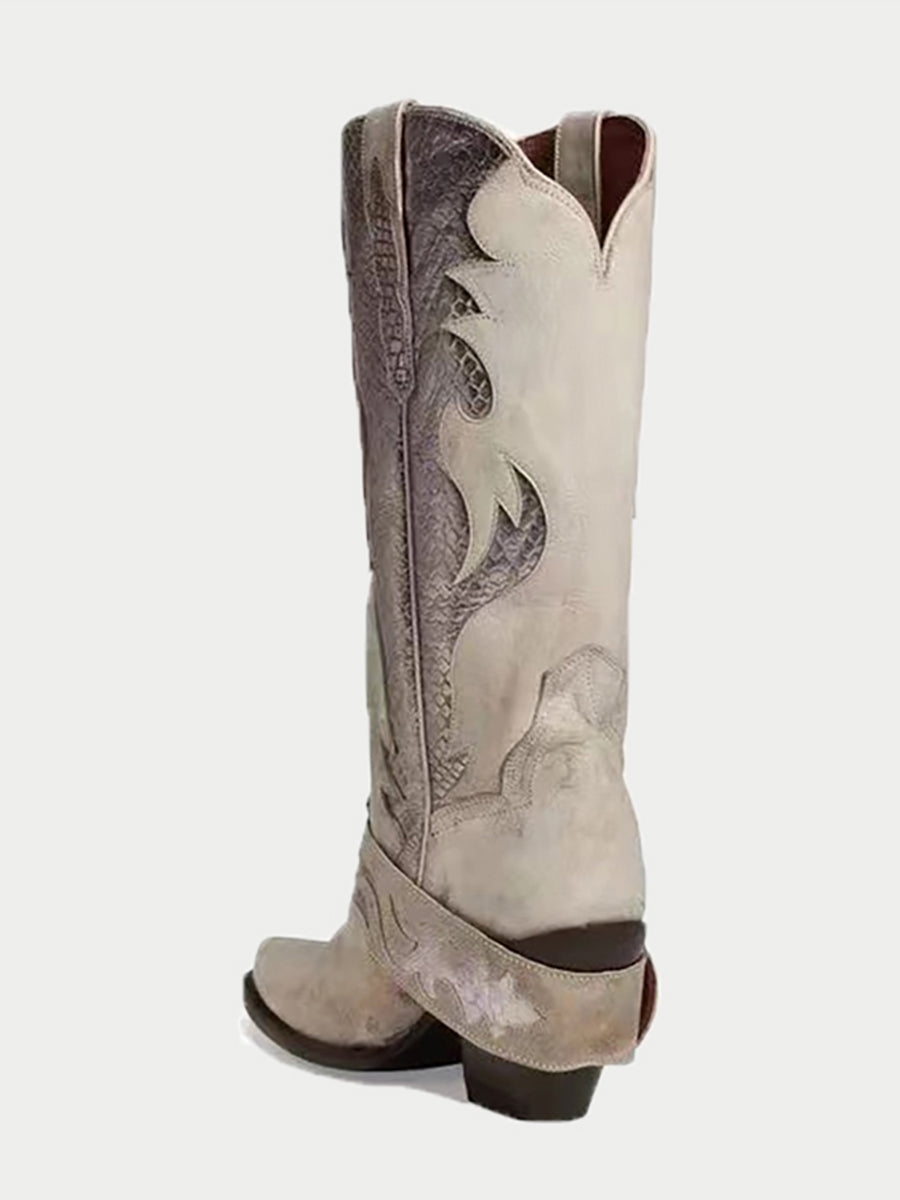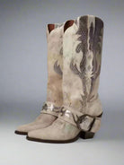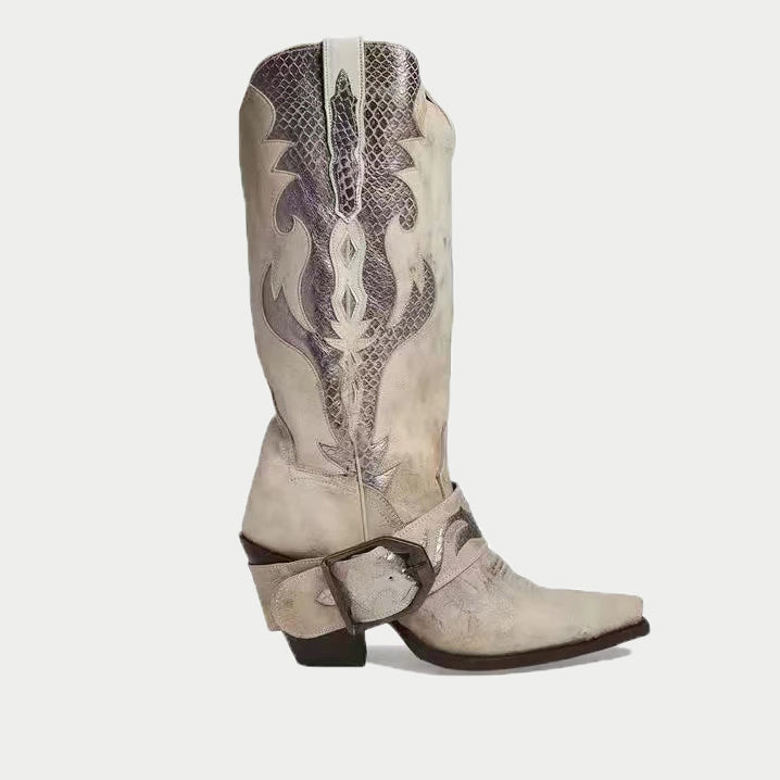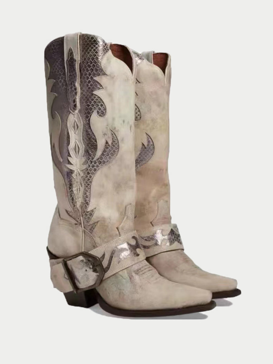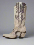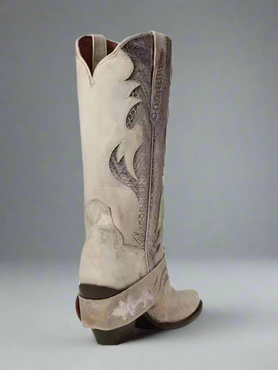 Ashore Western Shop luxurious Western cowgirl boot exudes high-end craftsmanship and bold Western flair. Designed in a soft, distressed ivory leather, the boot features intricate overlays of metallic python-textured leather in flame-like patterns that climb dramatically up the shaft. The striking embellishments are both elegant and edgy, evoking a vintage-meets-modern aesthetic. A standout feature is the wide leather strap across the instep, adorned with matching python detail and secured with a large, antiqued metal buckle, enhancing its statement appeal. With a pointed toe, angled Cuban heel, and scalloped collar, this boot is a sophisticated fusion of traditional Western roots and upscale designer edge.