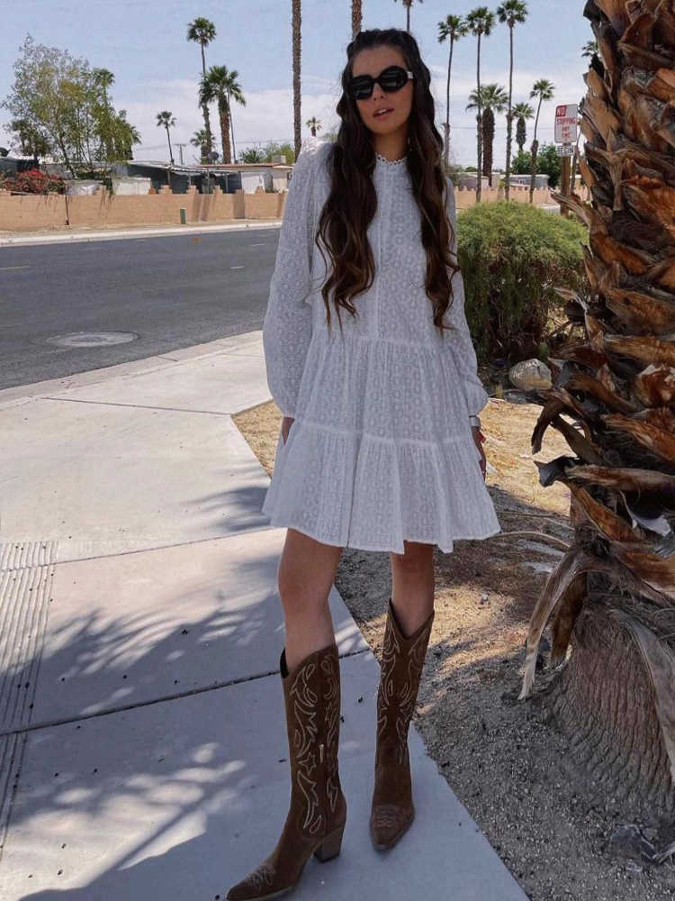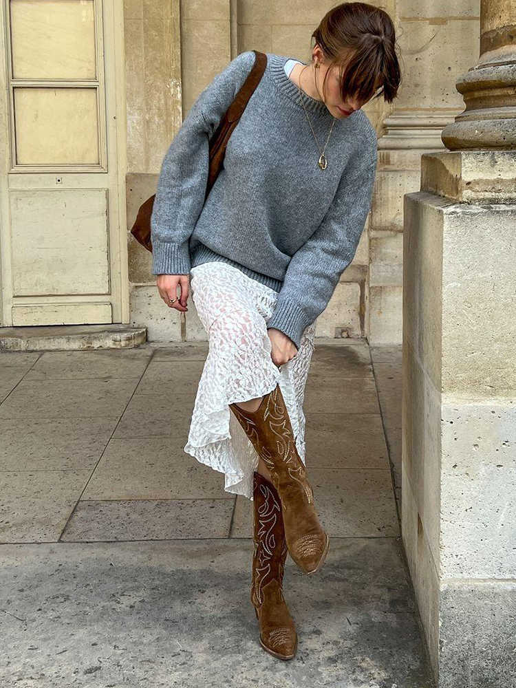 Ashore Western Shop western-embroidered cowgirl high brown boots are a chic and rugged pair, crafted from rich brown suede that exudes a warm, earthy tone. They feature an elegant pointed toe and a sturdy stacked heel, giving them a classic cowboy silhouette. The boots are adorned with intricate white stitching that forms swirling patterns and star motifs, adding a touch of traditional western flair. Extending to knee-high length, they complement the lace-trimmed white skirt and gray sweater worn by the person in the image, blending seamlessly with the cobblestone setting. The detailed embroidery and soft suede texture make these boots a standout accessory for a stylish, outdoorsy look.