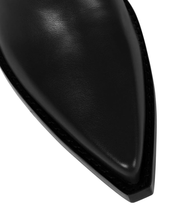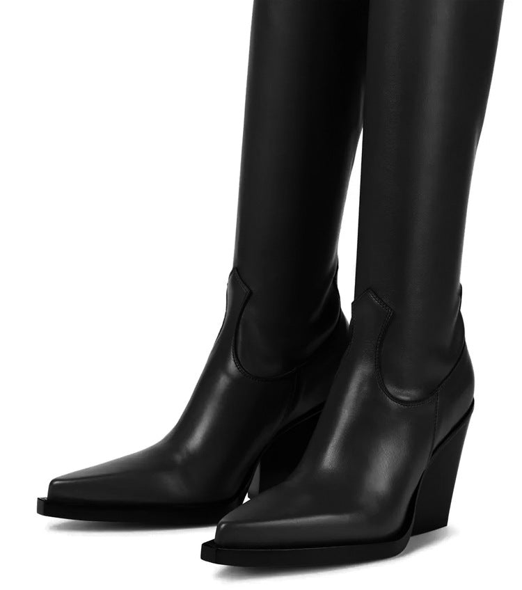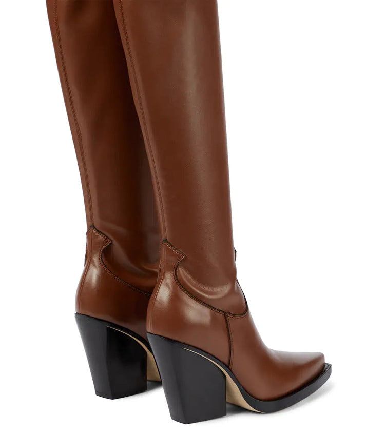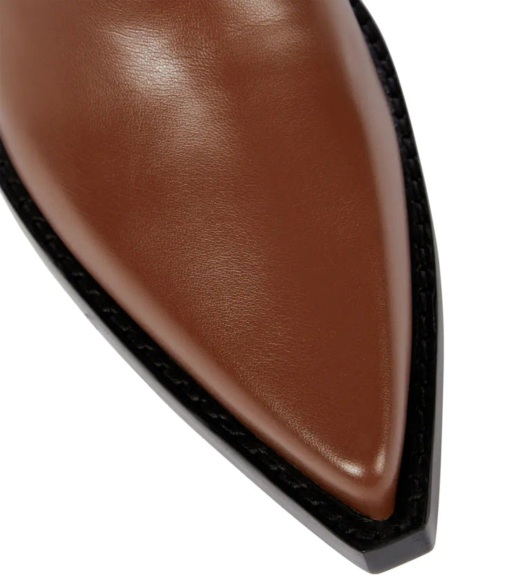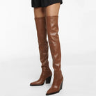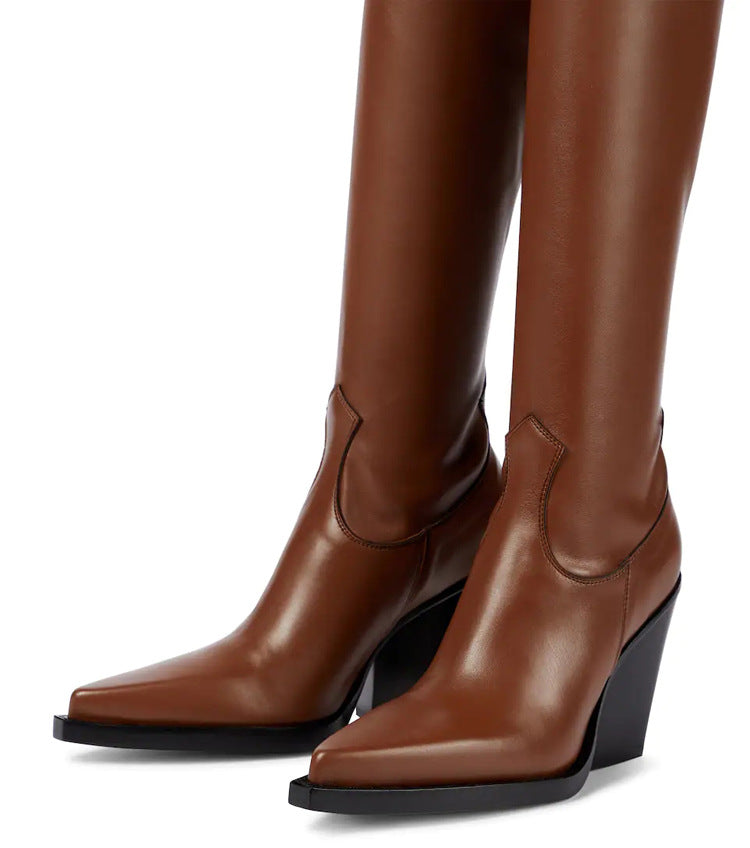 Urban Commuter women’s over-the-knee boots exude modern Western sophistication with a bold, fashion-forward twist. Crafted from smooth, rich brown leather, they feature a sleek, elongated silhouette that hugs the legs for a flattering fit. The sharply pointed toe and sculpted wedge heel add a dramatic edge, while subtle Western-inspired stitching at the shaft base nods to classic cowboy boot design. Set on a durable black sole with defined welt detailing, these boots blend urban chic with rugged elegance—perfect for making a statement in both city streets and upscale outings.