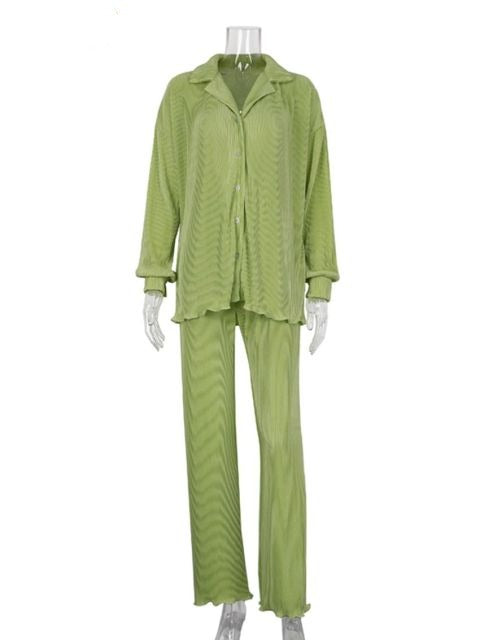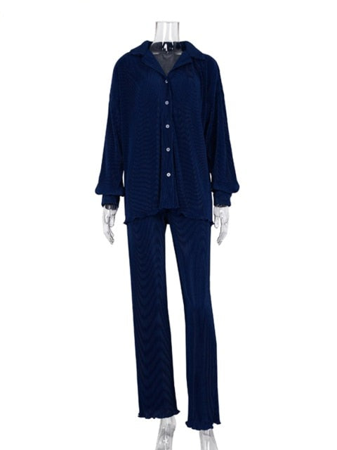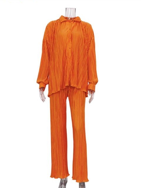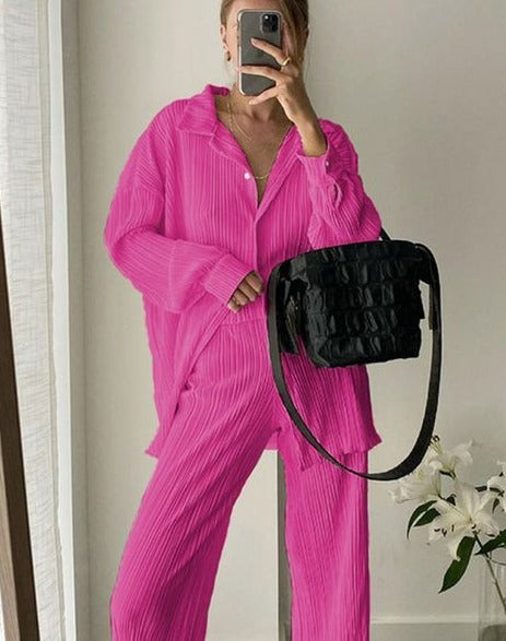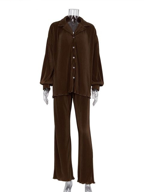 Ashore Shop: Women Elegant Pleated Beige 2 Piece Pant Sets Comfortable Loose Home Suit Autumn Long Sleeve Blouse With High Waist Pants Set