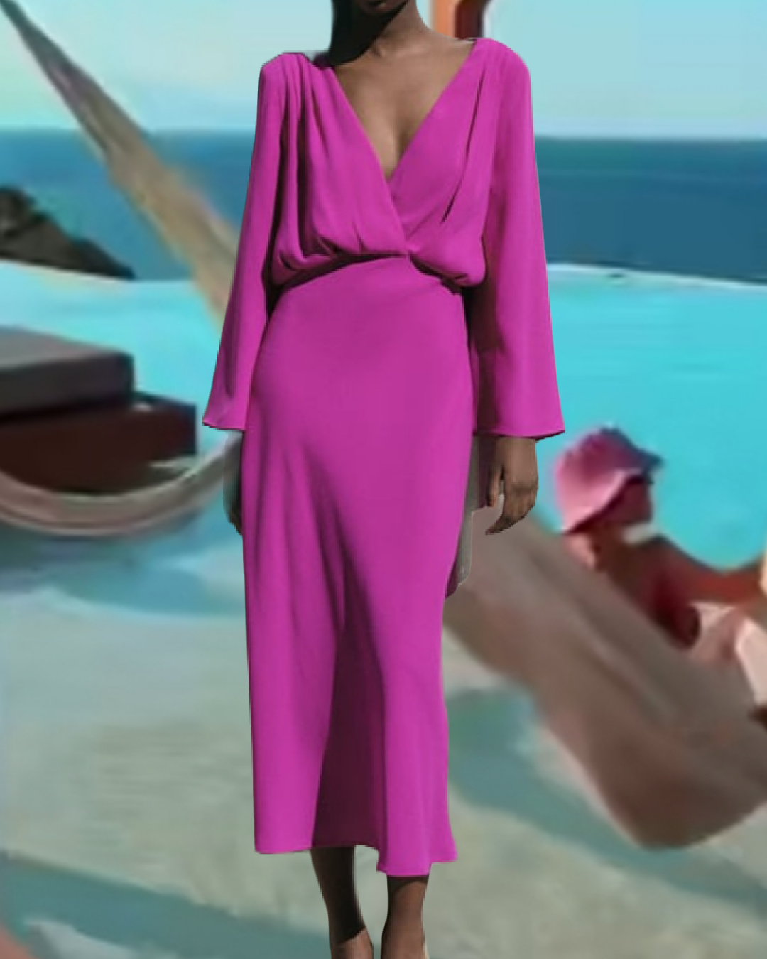 Elegant Women Solid Mid-Calf Dresses 2023 New Summer Fashion Deep V-neck A-line Long Sleeve Vestidos