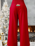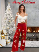 Ashore Christmas festive red pants bring cheerful holiday spirit to any cozy look, featuring a collection of playful Christmas-themed embroidery patches scattered across the legs. The bright, saturated red fabric sets the perfect backdrop for charming motifs such as candy canes, gingerbread characters, Santa, reindeer, and sweet treats. Designed with a relaxed, wide-leg silhouette and a comfortable smocked waistband, the pants offer both ease and style, making them ideal for lounging, holiday gatherings, or festive photo moments. Their whimsical details and vibrant colors create a fun, joyful piece that instantly celebrates the season.