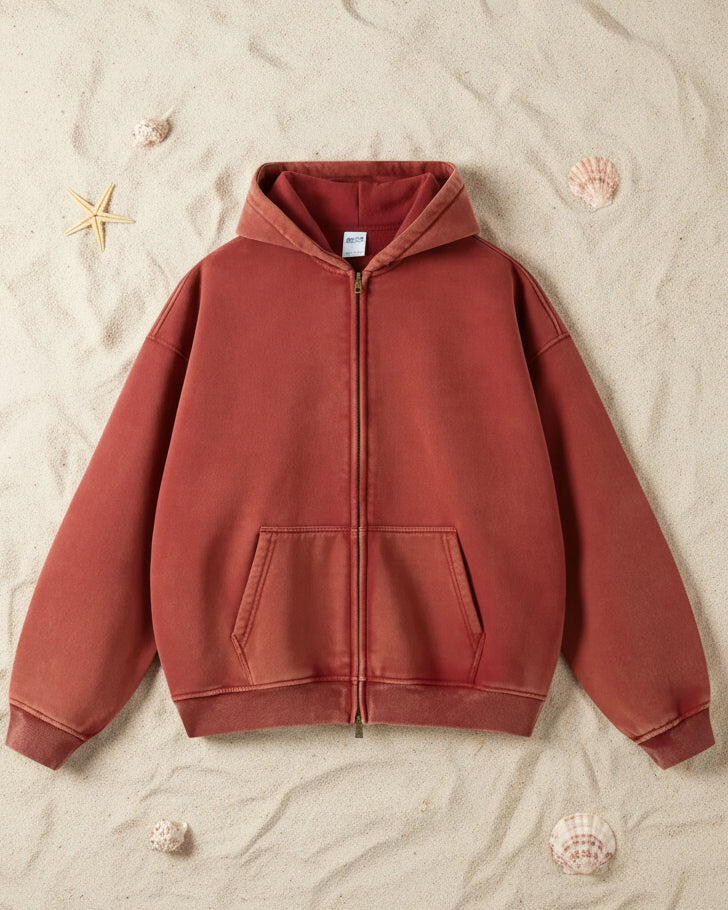 Ashore Full Zipper Sand Washed Soft Sweatshirt Hoodie is a unisex essential designed with a relaxed, oversized silhouette for effortless everyday wear. Crafted from heavyweight, ultra-soft fabric, it features a distinctive sand-washed finish that gives it a subtly faded, vintage-inspired look and a smooth, lived-in feel. The hoodie includes a spacious hood, dropped shoulders, ribbed cuffs and hem for structure, and a classic kangaroo pocket for added comfort and functionality. Its clean, minimal design makes it versatile and easy to style, while the range of multiple color options allows for both neutral basics and statement shades, making it a comfortable yet stylish staple for any casual wardrobe.
