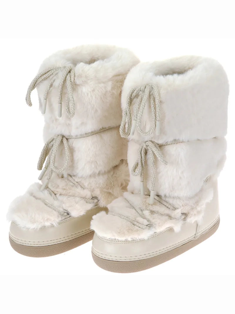 2023 Winter Fur Boots Snow Boots Women Ski Boots Fluffy Hairy Lace Up Middle Calf Platform Flat With White Cotton Boots