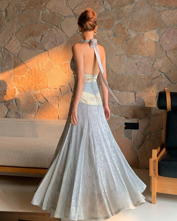 The halter-neck design highlights the shoulders, while the fitted bodice with delicate embellishments enhances the waistline for a flattering silhouette. The floor-length flowing skirt moves gracefully, creating a mesmerizing effect as you walk. The subtle silver sparkle catches the light effortlessly, exuding a radiant glow.