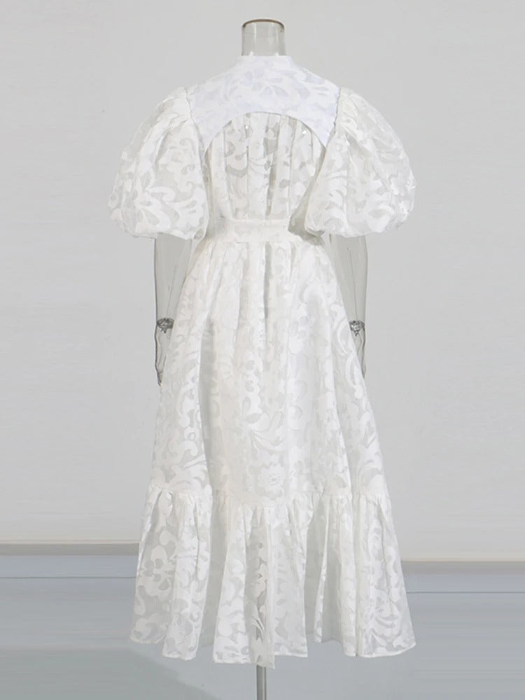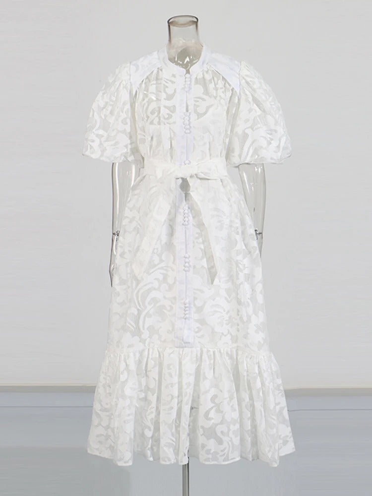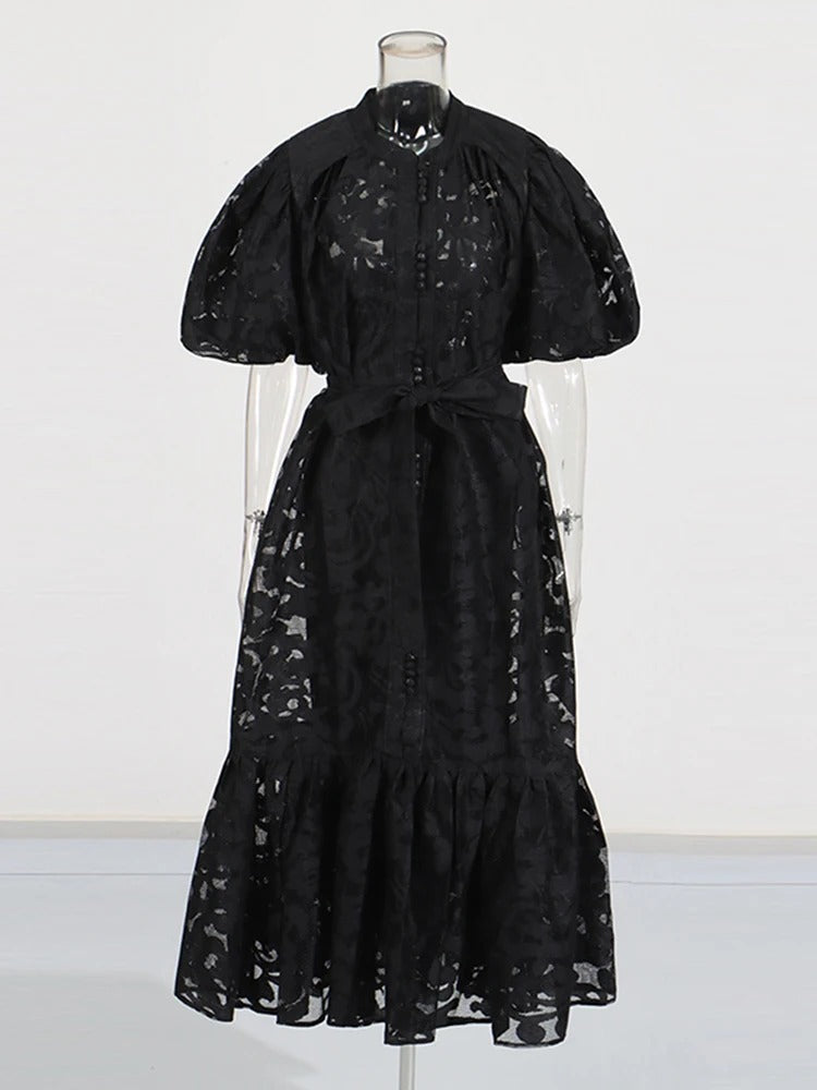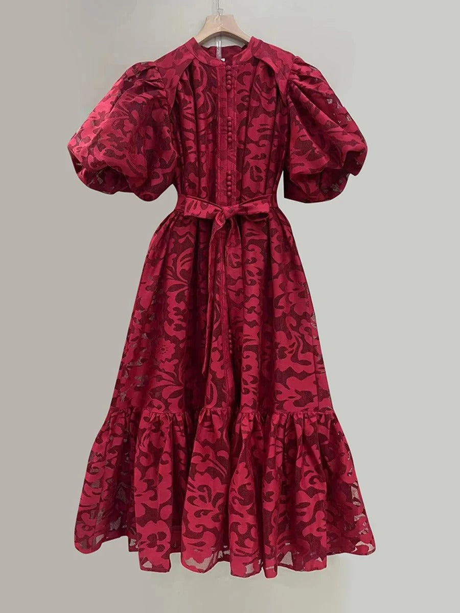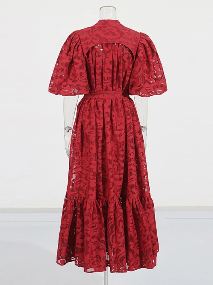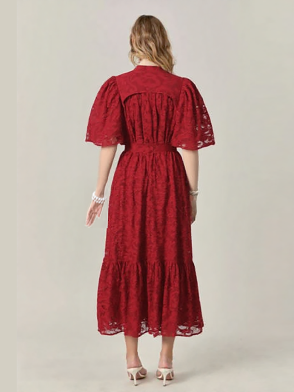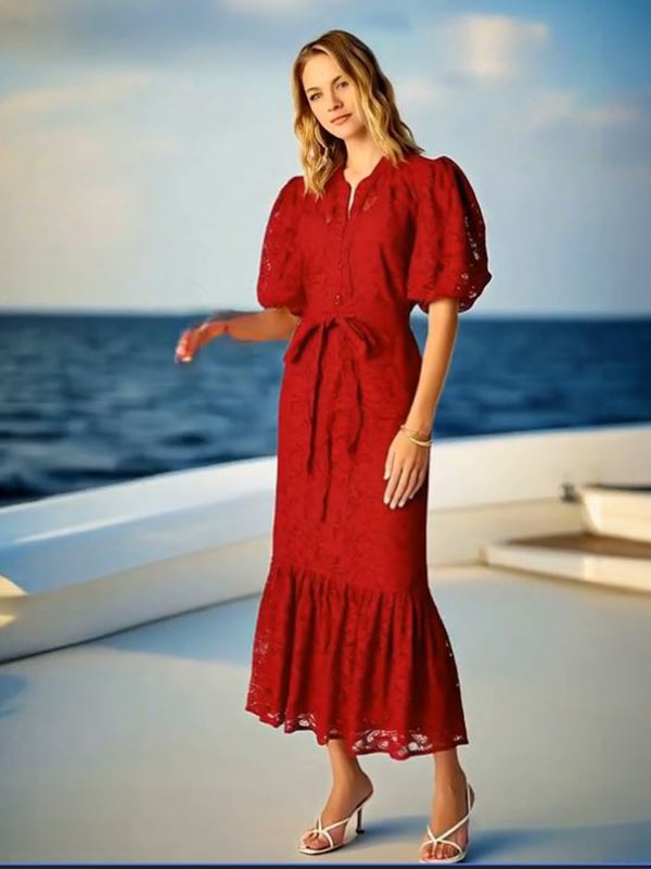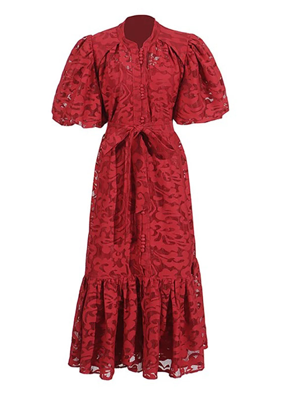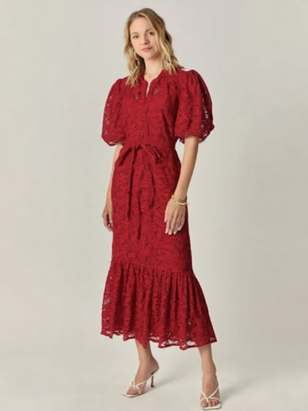 Ashore Shop Red Puffy Short Sleeve Long Lace Dresses elegant crimson red lace dress exudes timeless femininity and charm. Crafted from delicate floral lace, it features voluminous puff sleeves and a modest round neckline with a subtle keyhole detail, adding a soft romantic touch. The dress is cinched at the waist with a matching lace belt, enhancing the silhouette before flowing into a graceful midi-length skirt with a gathered hem for added movement. Fully lined for comfort and structure, this dress combines vintage-inspired design with modern sophistication, making it a perfect choice for special occasions, garden parties, or evening events.