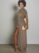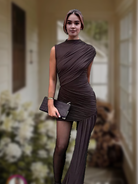 Ashore asymmetrical one-shoulder knitted mini dress featuring a dramatic drape detail. Crafted from a stretch-knit fabric that hugs the body, this figure-flattering piece blends sophistication with high-fashion edge. The gathered ruching across the bodice and waist enhances curves, while the sleek one-shoulder neckline adds an elegant, sculptural touch. The standout feature is the contrast in hemline—a mini length on one side balanced by an elongated draped panel on the other, creating a fluid, high-fashion silhouette that moves gracefully. Ideal for upscale parties or editorial-style evenings.