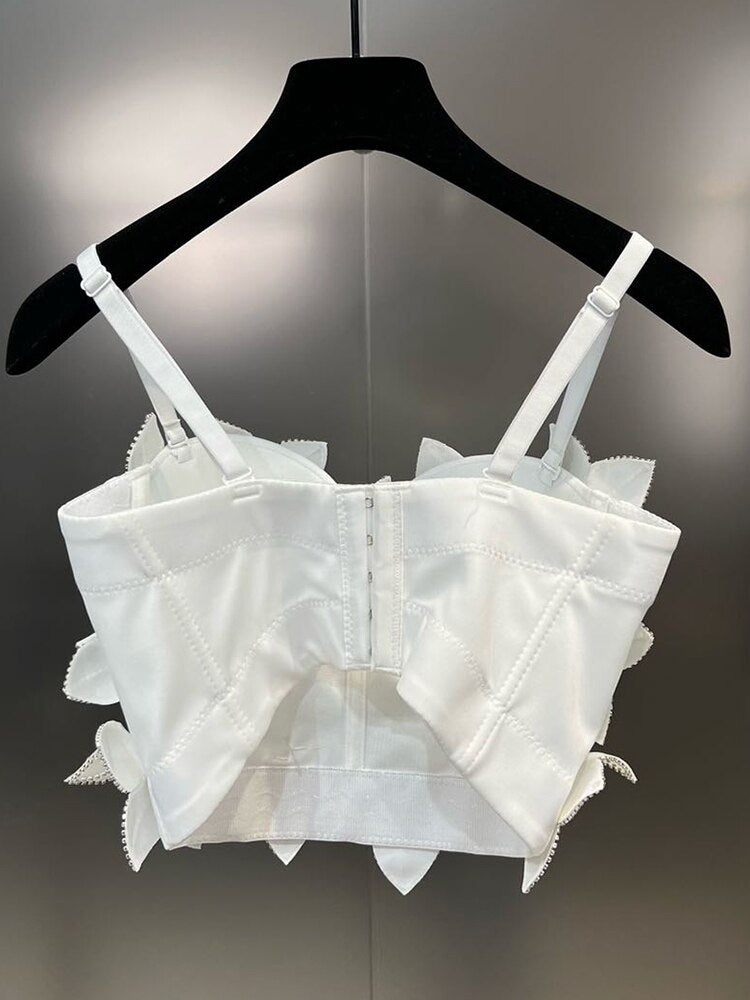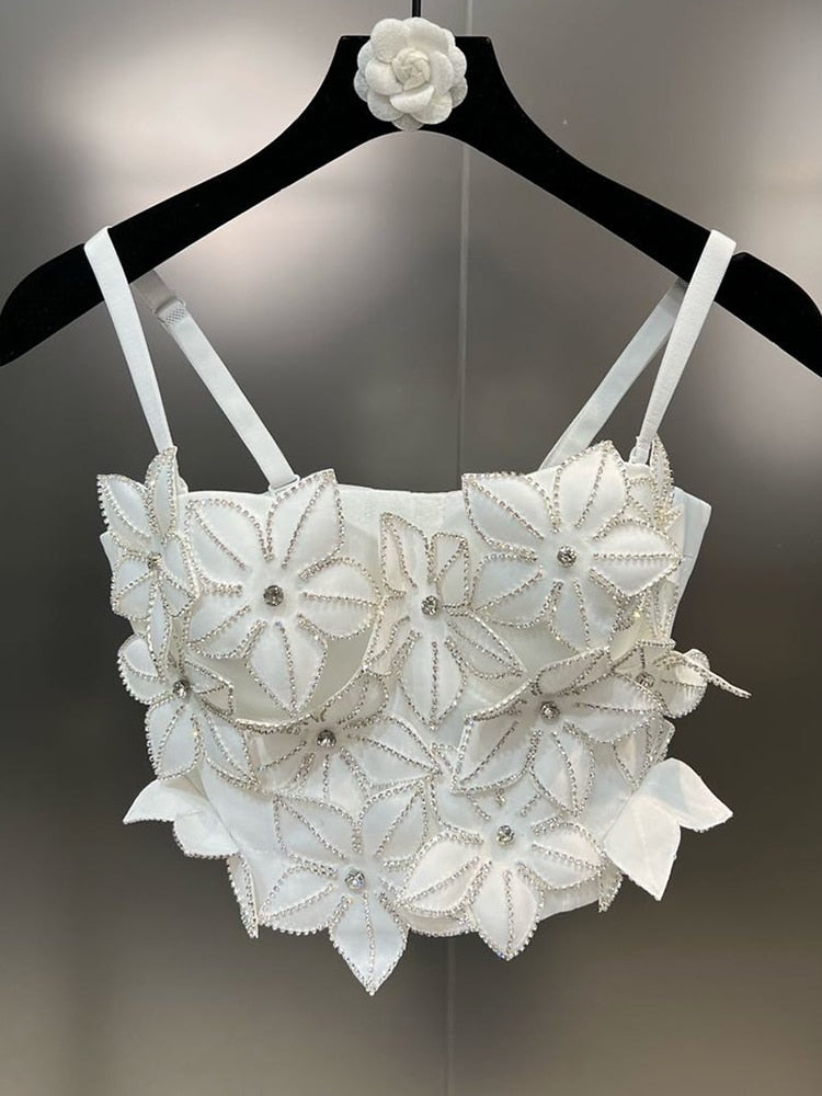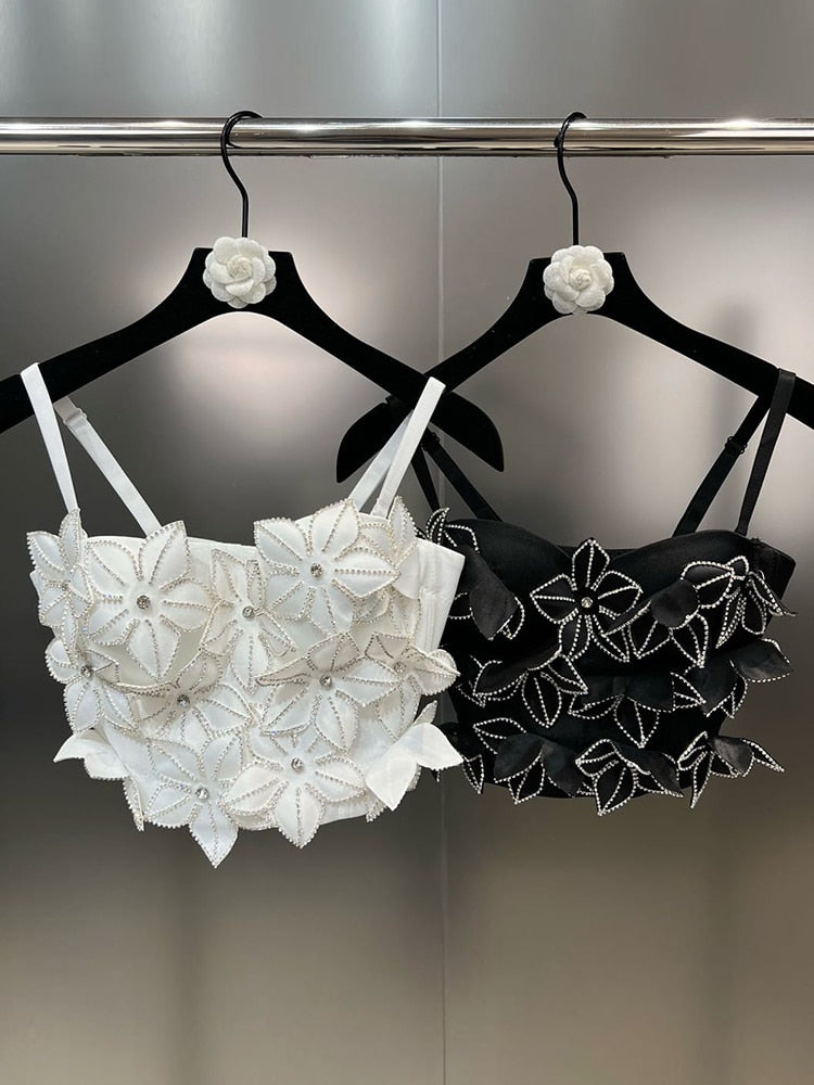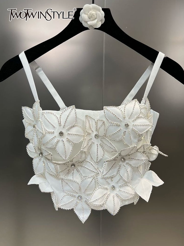 3D Flower Sexy Slim Crop Top Female Square Collar Sleeveless Patchwork Diamond Appliques Solid Vests Women Clothing 2023 New