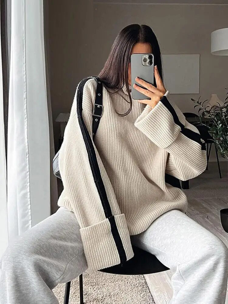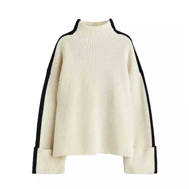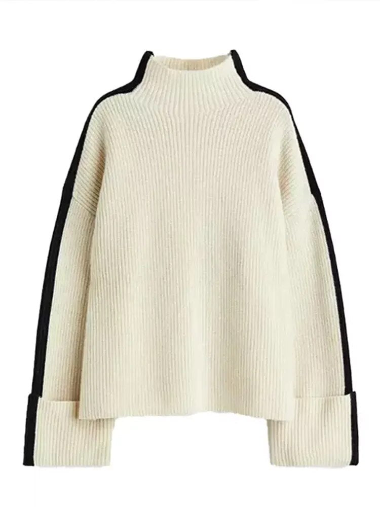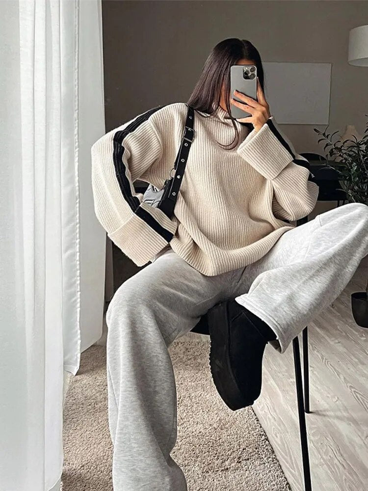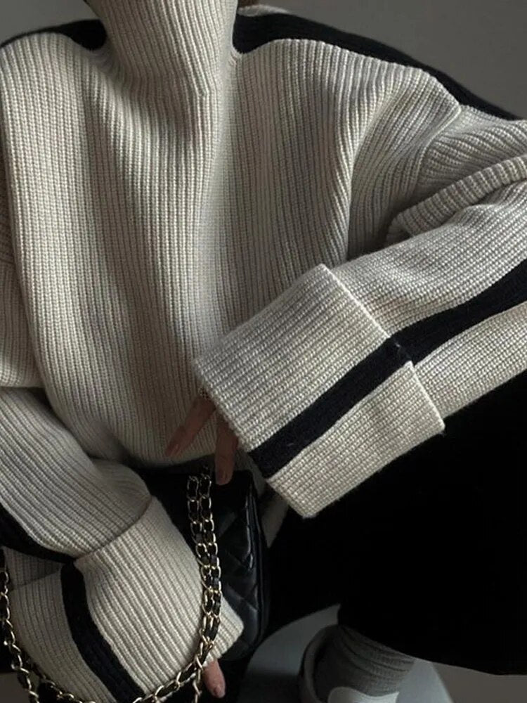 Turtleneck Panelled Kint Women Pullover Sweater Long Sleeve Striped Casual Female Sweaters 2023 Autumn Elegant Lady Clothes