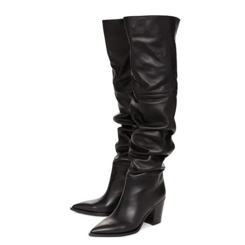 Spring Autumn Punk Pointed Toe Square Heels Women Over The Knee Boots Leather Boots