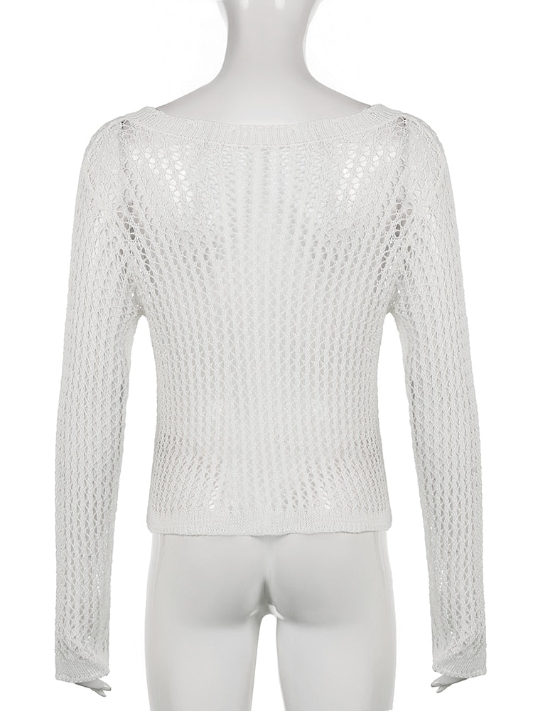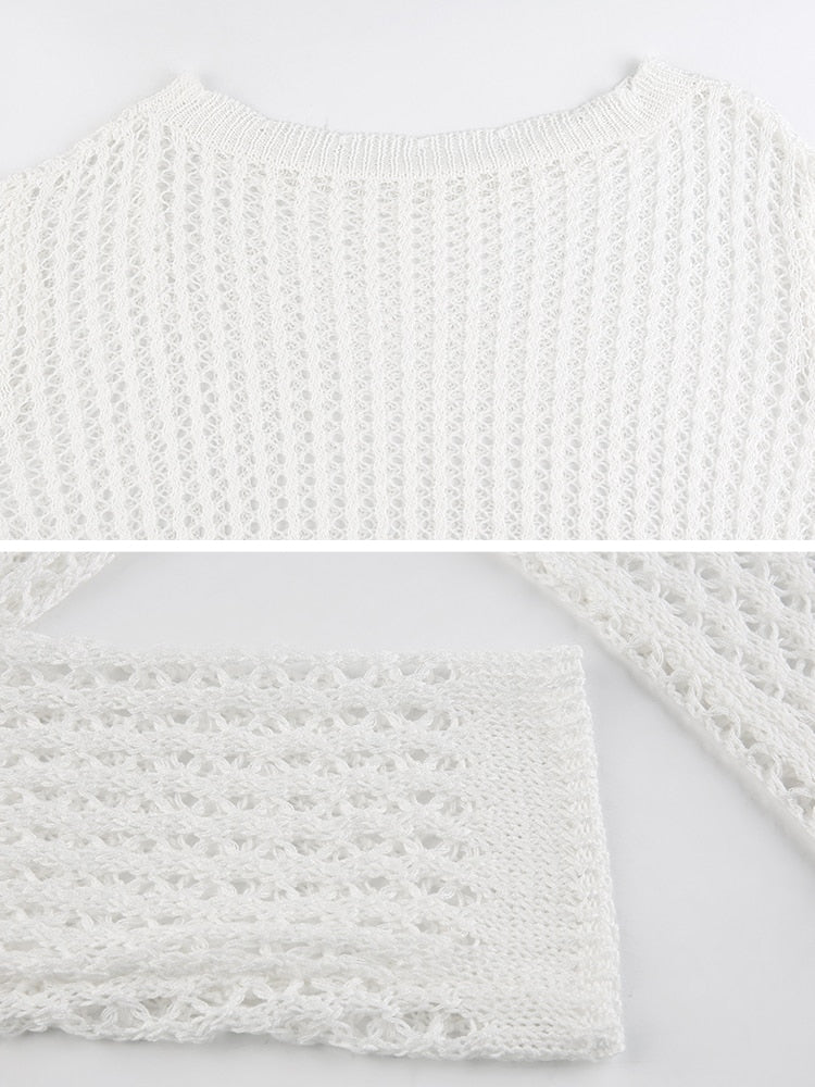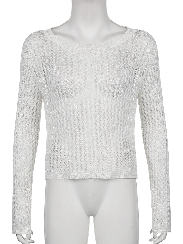White Crochet Knit Tops Women Sexy Hollow Out Fashion Casual Wide Smock Tee Long Sleeve Pullover Tee Shirt Aesthetic