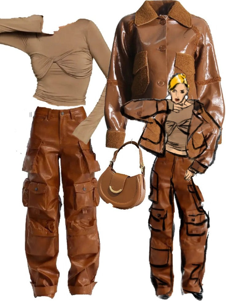 Ashore Shop Women Leather Pants Multi Pockets High Waist Trousers Loose Casual All Match Long PU Cargo Pants